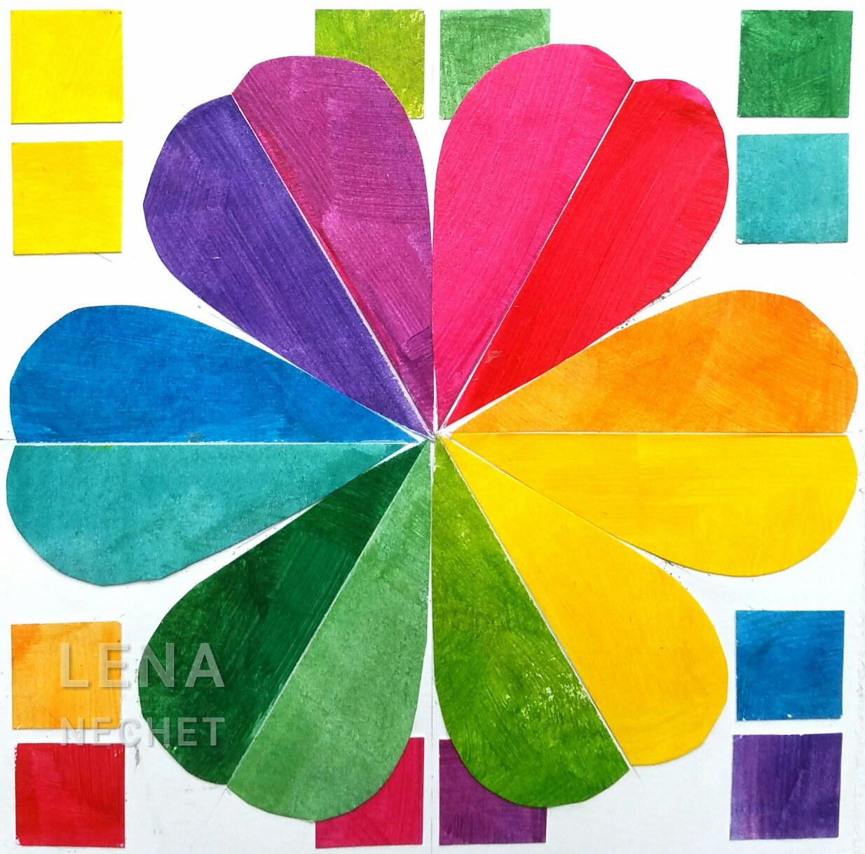 This is a flower-shaped 12-hue color wheel, with squares of opposite color next to each petal, a split of a cool and warm version of the similar hue. Warm hues are on the right: cool and warm red, orange and mid-yellow, cool lemon yellow and lime colors. The are followed by the cool colors on the left: warm and cool green, cyan and royal blue, violet and purple. Hue is an attribute of color, an art design element. The six petals illustrate harmony, an art design principle.elements, principles, harmony, color, wheel, flower
