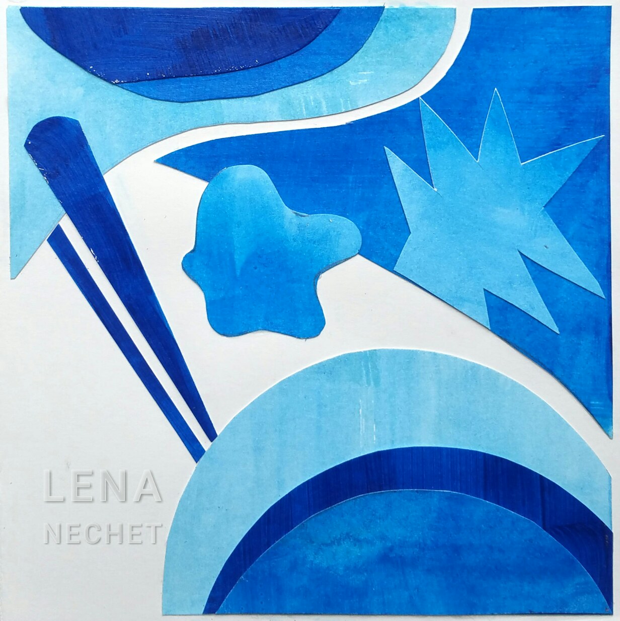 This collage in six tints of one color, from mid-value to sky-blue, illustrates saturation of color, a main art design element. With just changes in color saturation in a monochrome image, one can achieve both gradual change and contrast. It also demonstrates variety, one part of the art design principle harmony, with shapes of different sizes and and contours. elements, principles, saturation, variety, harmony
