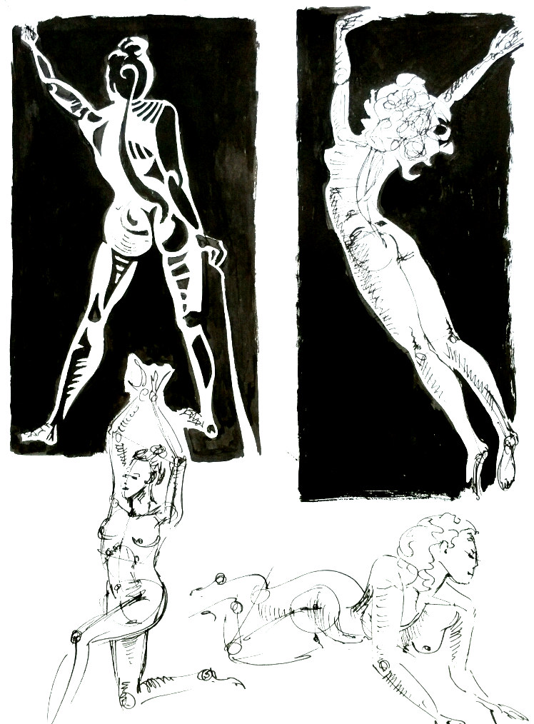 Nude female figure study, white on black and black on white, including figure abstraction from the back, black India ink on a page of my sketchbook.